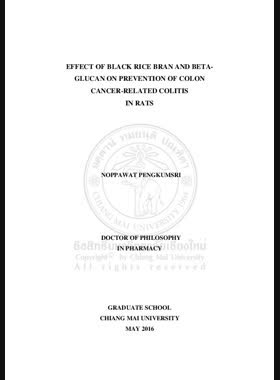 | ชื่อเรื่อง | Effect of black rice bran and beta-glucan on prevention of colon cancer-related colitis in rats = ผลของรำข้าวดำและบีต้ากลูแคนต่อการป้องกันลำไส้อักเสบที่สัมพันธ์กับมะเร็งลำไส้ใหญ่ในหนูขาว / Noppawat Pengkumsri |