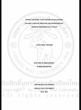 | ชื่อเรื่อง | Effect of kojic and methyleugenol on induction of hepatocarcinogenesis by medium-term bioassay in rat = ผลของกรดโคจิกและเมทิลยูจีนอลต่อการเหนี่ยวนำการเกิดมะเร็งตับโดยการทดสอบทางชีวภาพระยะกลางในหนู / Yaowares Chusiri |