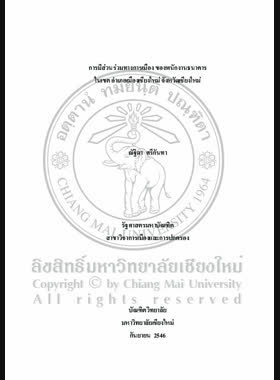 | ชื่อเรื่อง | การมีส่วนร่วมทางการเมืองของพนักงานธนาคารในเขต อำเภอเมืองเชียงใหม่ จังหวัดเชียงใหม่ / ณัฐิดา ศรีกันทา |
