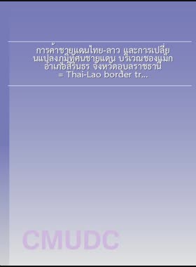 | ชื่อเรื่อง | การค้าชายแดนไทย-ลาว และการเปลี่ยนแปลงภูมิทัศน์ชายแดน บริเวณช่องแม็ก อำเภอสิรินธร จังหวัดอุบลราชธานี = Thai-Lao border trade and border landscape change in Chong Mek Area, Sirindhorn District, Ubon Ratchathani Province / อัญญา บูชายันต์ |