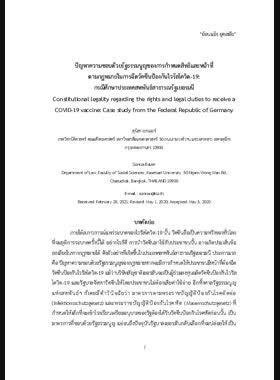 | ชื่อเรื่อง | ปัญหาความชอบด้วยรัฐธรรมนูญของการกำหนดสิทธิและหน้าที่ ตามกฎหมายในการฉีดวัคซีนป้องกันไวรัสโควิด-19: กรณีศึกษาประเทศสหพันธ์สาธารณรัฐเยอรมนี |